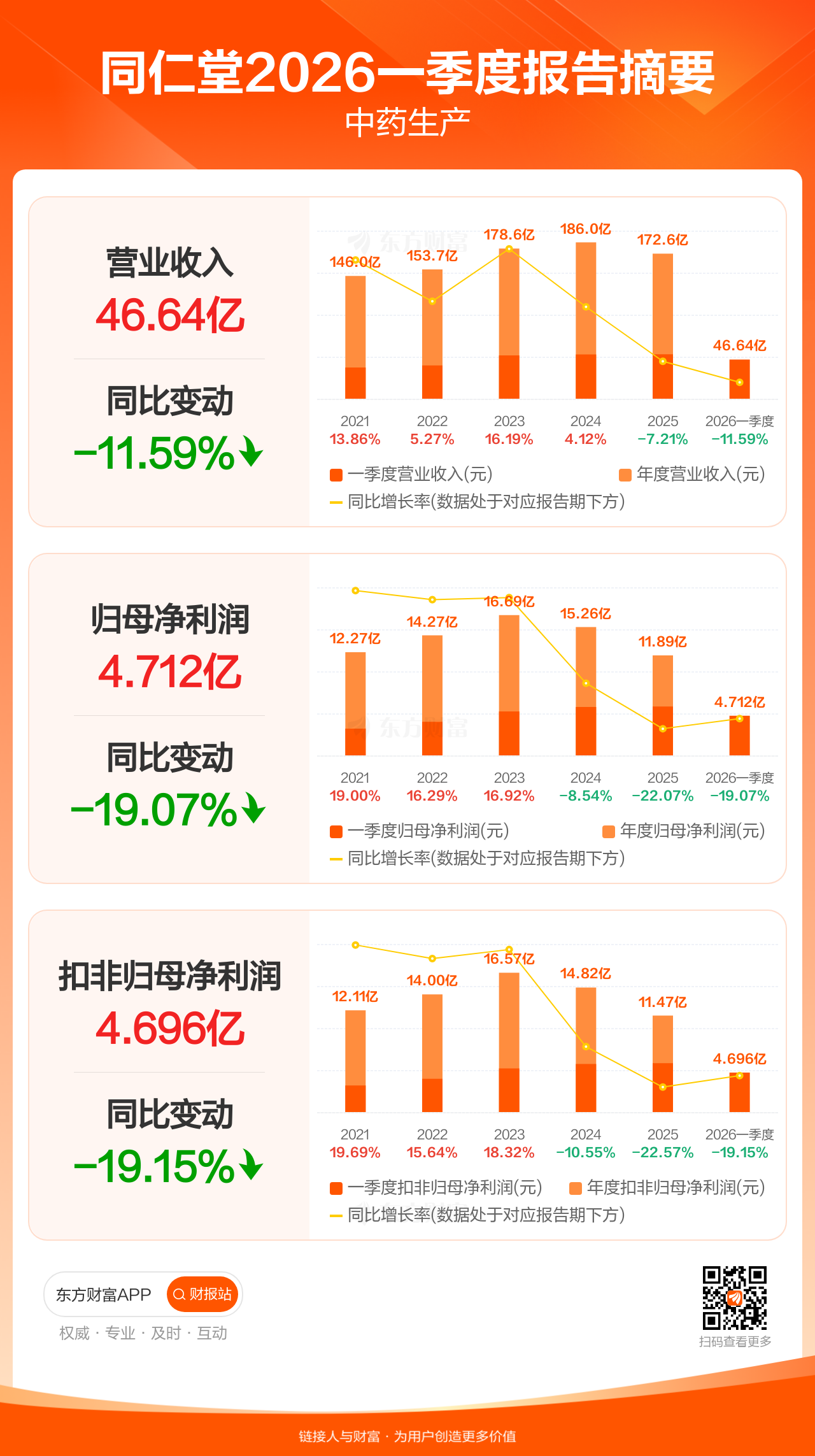 同仁堂4月30日发布2026年一季报显示,公司一季度实现营业收入46.64亿元,同比下滑11.59%;归母净利润4.71亿元,同比下滑19.07%;扣非归母净利润4.70亿元,同比下滑19.15%。