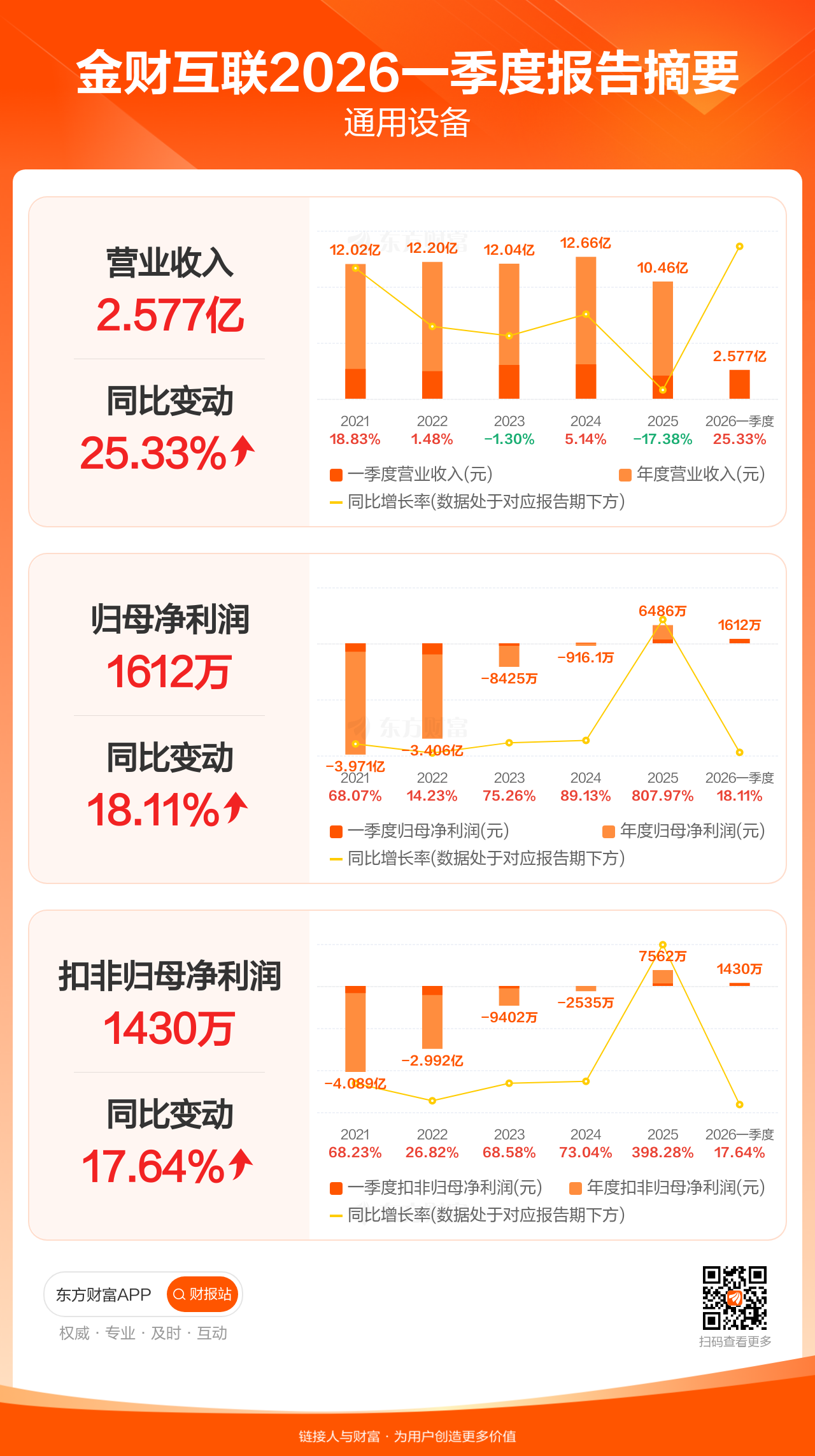 金财互联4月30日发布2026年一季报显示,公司一季度实现营业收入2.58亿元,同比增长25.33%;归母净利润1611.87万元,同比增长18.11%;扣非归母净利润1430.47万元,同比增长17.64%。