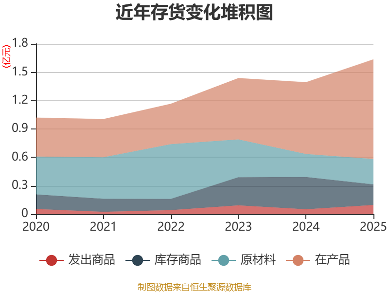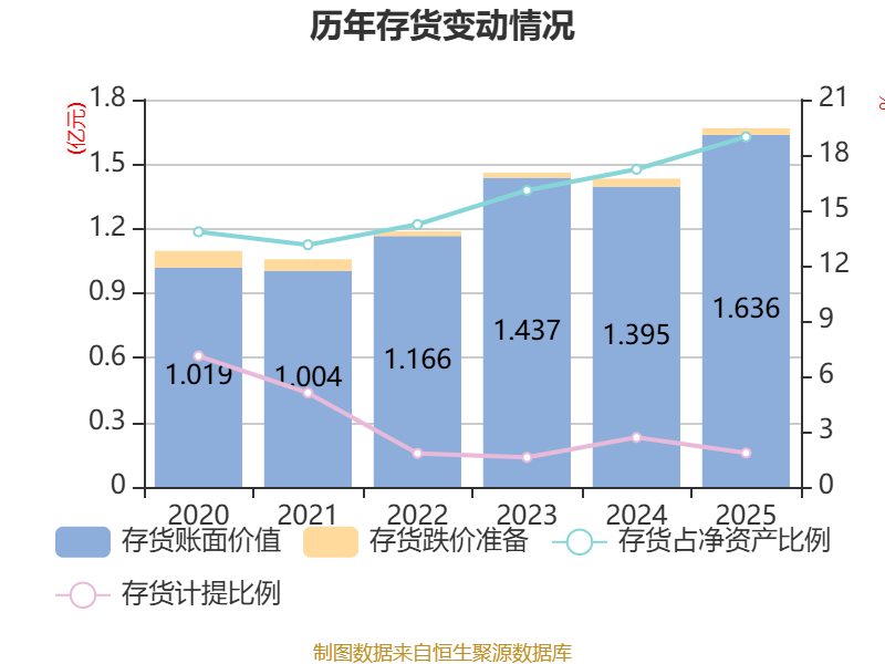 从存货变动来看,截至2025年末,公司存货账面价值为1.64亿元,占净资产的18.98%,较上年末增加2412.65万元。其中,存货跌价准备为306.3万元,计提比例为1.84%。