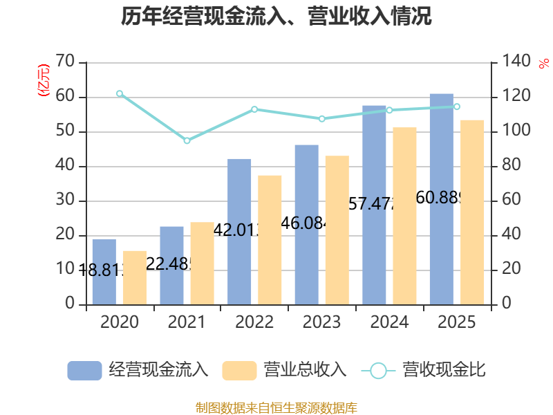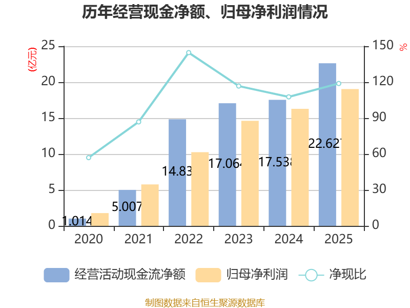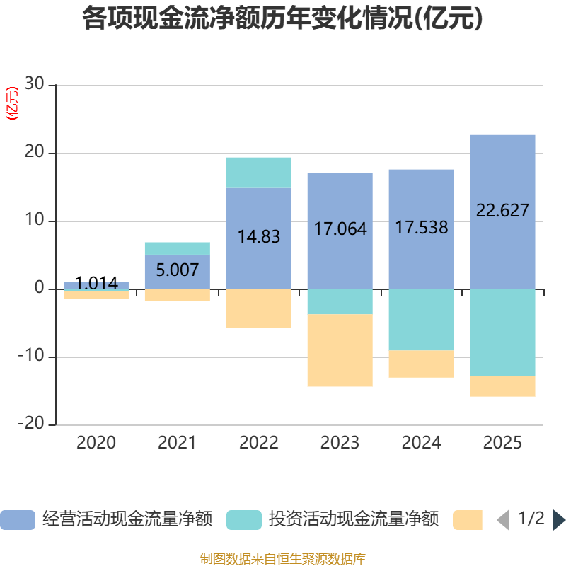 截至2025年,公司经营活动现金流净额为22.63亿元,同比增长29.01%;筹资活动现金流净额-3.08亿元,同比增加9133.49万元;投资活动现金流净额-12.82亿元,上年同期为-9.1亿元。