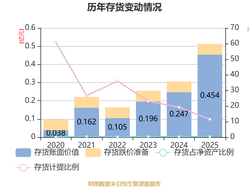 从存货变动来看,截至2025年末,公司存货账面价值为4543.68万元,占净资产的0.46%,较上年末增加2077.56万元。其中,存货跌价准备为586.99万元,计提比例为11.44%。