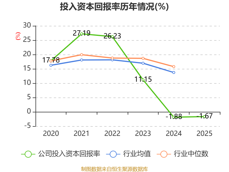 数据显示,2025年公司加权平均净资产收益率为-0.88%,较上年同期下降1.18个百分点。公司2025年投入资本回报率为-1.67%,较上年同期上升0.21个百分点。