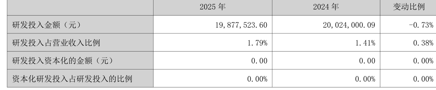 2025年全年,公司研发投入金额为1987.75万元,同比下降0.73%;研发投入占营业收入比例为1.79%,相比上年同期上升0.38个百分点。此外,公司全年研发投入资本化率为0%。