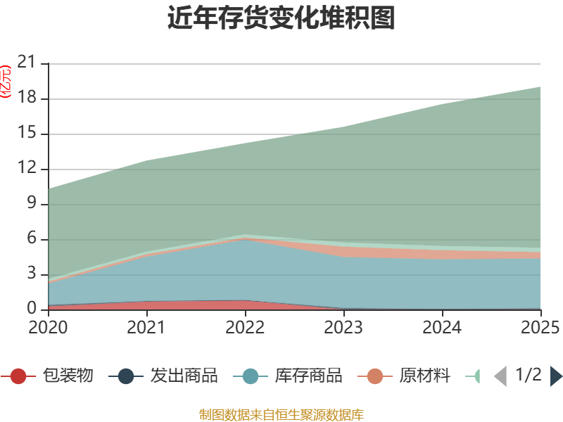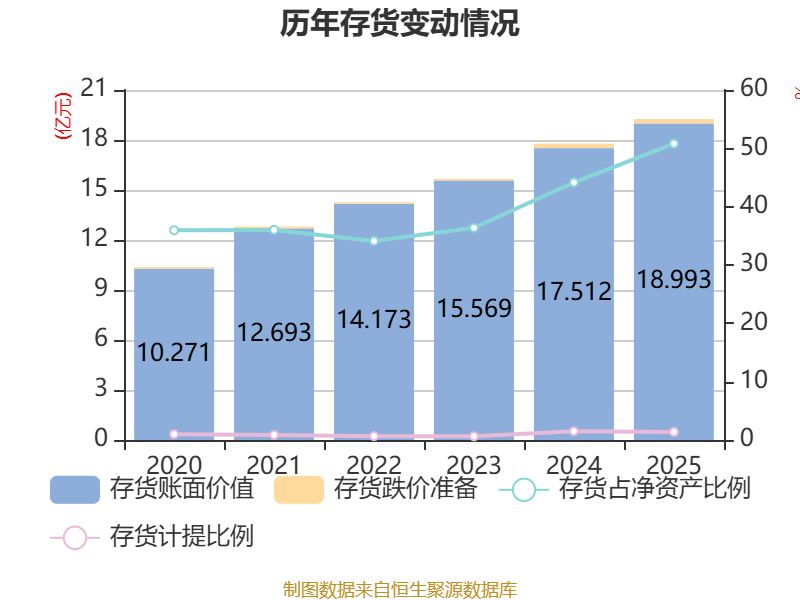 从存货变动来看,截至2025年末,公司存货账面价值为18.99亿元,占净资产的50.81%,较上年末增加1.48亿元。其中,存货跌价准备为2678.42万元,计提比例为1.39%。