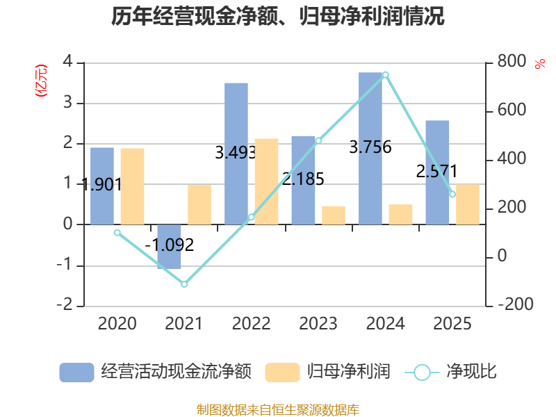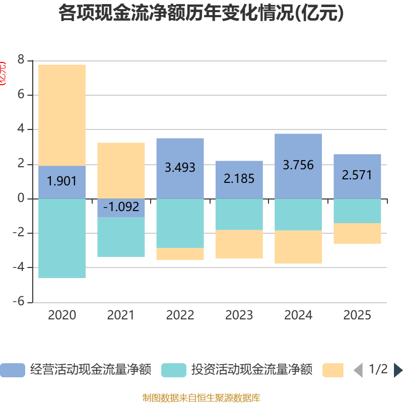 截至2025年,公司经营活动现金流净额为2.57亿元,同比下降31.55%;筹资活动现金流净额-1.19亿元,同比增加7178.77万元;投资活动现金流净额-1.42亿元,上年同期为-1.85亿元。