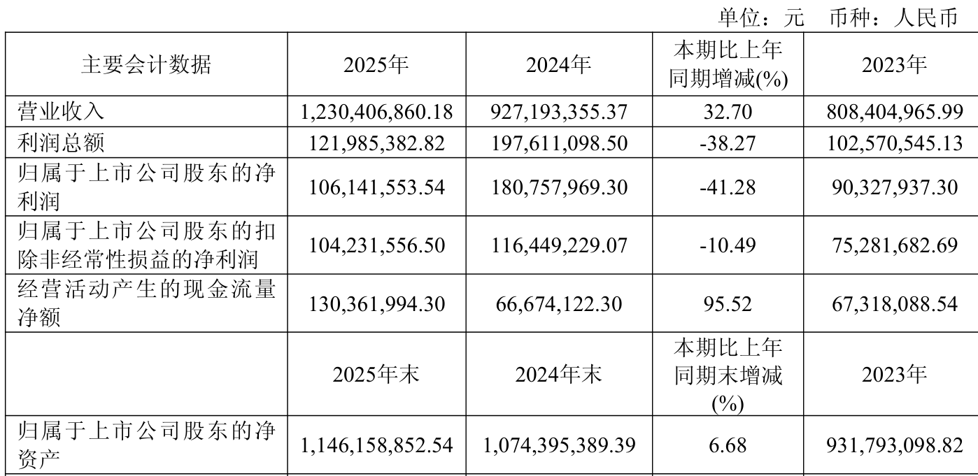 中证智能财讯赛恩斯(688480)4月29日披露2025年年度报告。2025年,公司实现营业总收入12.3亿元,同比增长32.70%;归母净利润1.06亿元,同比下降41.28%;扣非净利润1.04亿元,同比下降10.49%;经营活动产生的现金流量净额为1.3亿元,同比增长95.52%;报告期内,赛恩斯基本每股收益为1.11元,加权平均净资产收益率为9.68%。公司2025年度分配预案为:拟向全体股东每10股派现4.2元(含税)。