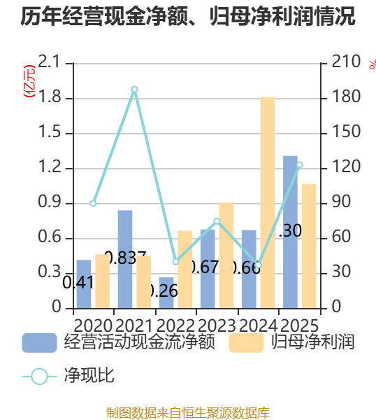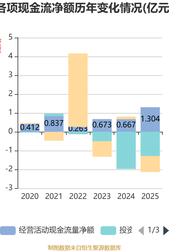 截至2025年,公司经营活动现金流净额为1.3亿元,同比增长95.52%;筹资活动现金流净额-8551.71万元,同比减少9930.73万元;投资活动现金流净额-1.28亿元,上年同期为-1.98亿元。