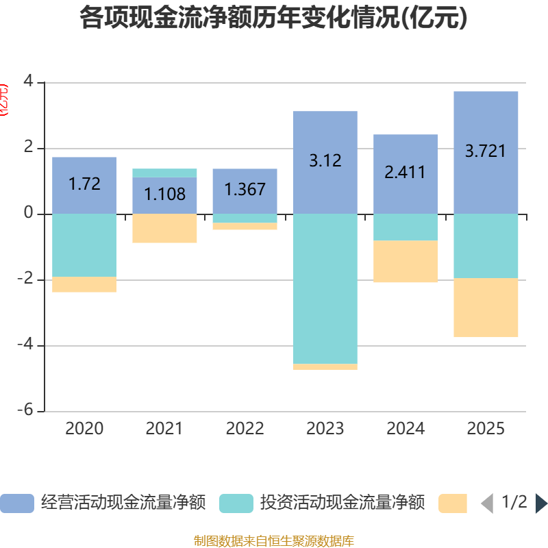 截至2025年,公司经营活动现金流净额为3.72亿元,同比增长54.33%;筹资活动现金流净额-1.79亿元,同比减少5234.95万元;投资活动现金流净额-1.96亿元,上年同期为-8203.46万元。