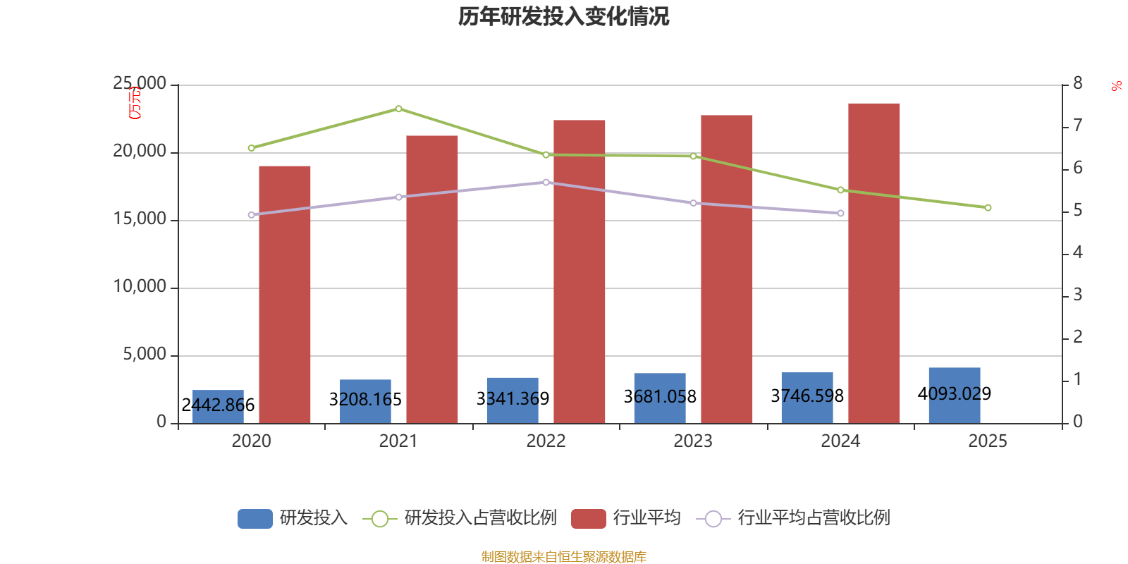 2025年全年,公司研发投入金额为4093.03万元,同比增长9.25%;研发投入占营业收入比例为5.09%,相比上年同期下降0.42个百分点。