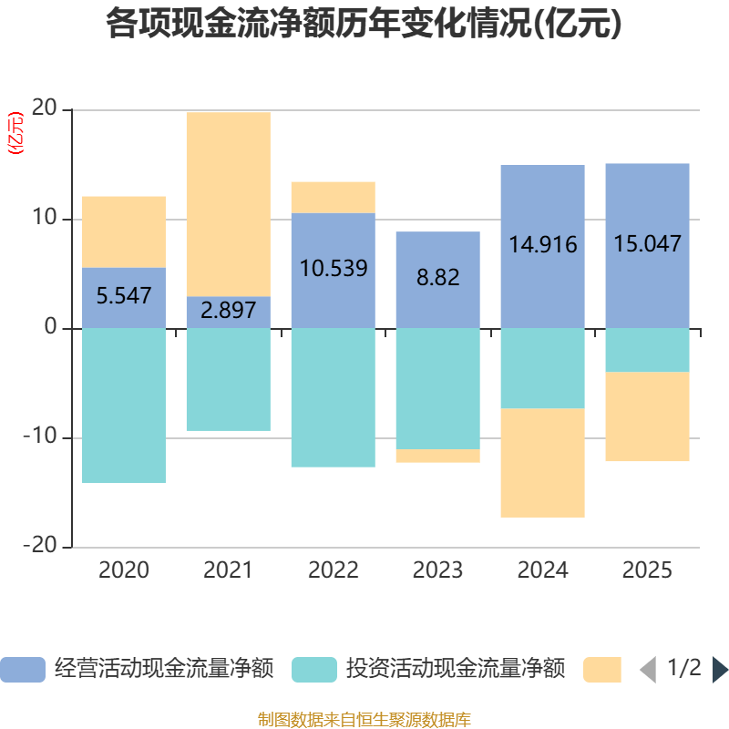 截至2025年,公司经营活动现金流净额为15.05亿元,同比增长0.88%;筹资活动现金流净额-8.13亿元,同比增加1.82亿元;投资活动现金流净额-4.04亿元,上年同期为-7.38亿元。