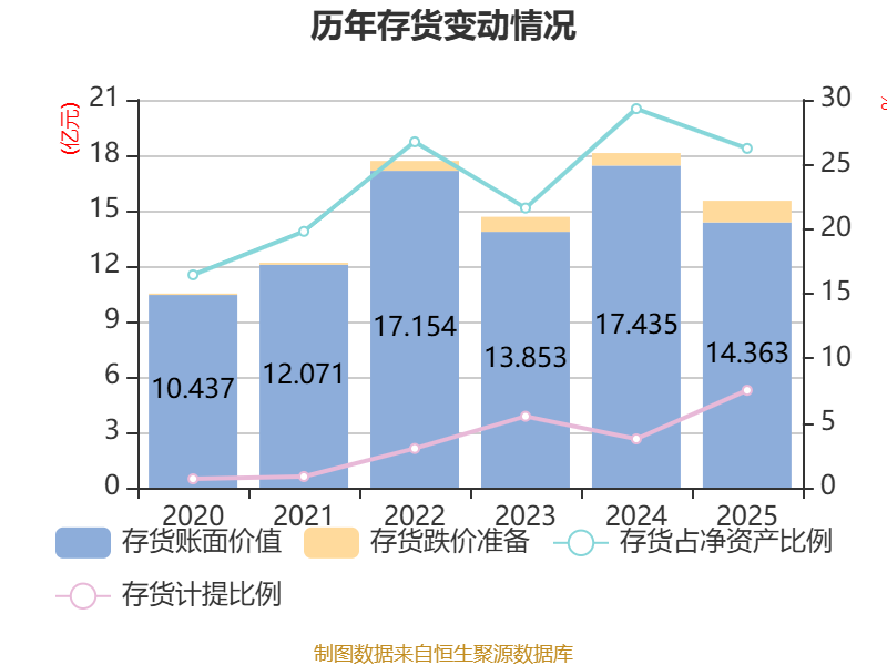 从存货变动来看,截至2025年末,公司存货账面价值为14.36亿元,占净资产的26.24%,较上年末减少3.07亿元。其中,存货跌价准备为1.17亿元,计提比例为7.53%。