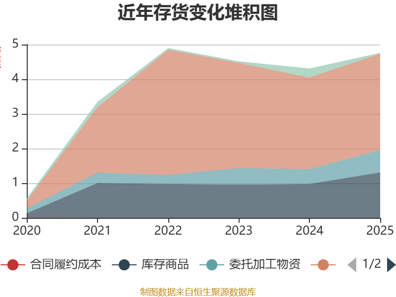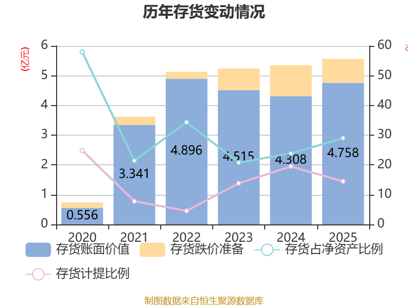 从存货变动来看,截至2025年末,公司存货账面价值为4.76亿元,占净资产的29%,较上年末增加4495.37万元。其中,存货跌价准备为8059.11万元,计提比例为14.48%。