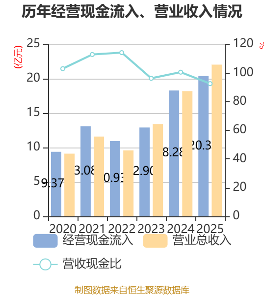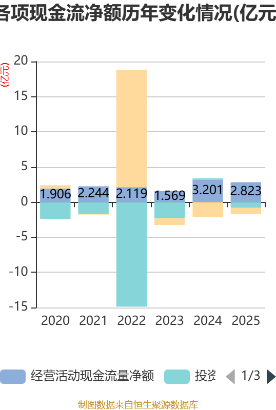 截至2025年,公司经营活动现金流净额为2.82亿元,同比下降11.82%;筹资活动现金流净额-9235.81万元,同比增加1.18亿元;投资活动现金流净额-7799.8万元,上年同期为1720.64万元。