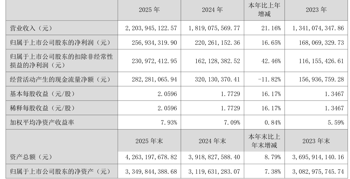 中证智能财讯唯科科技(301196)4月29日披露2025年年度报告。2025年,公司实现营业总收入22.04亿元,同比增长21.16%;归母净利润2.57亿元,同比增长16.65%;扣非净利润2.31亿元,同比增长42.46%;经营活动产生的现金流量净额为2.82亿元,同比下降11.82%;报告期内,唯科科技基本每股收益为2.0596元,加权平均净资产收益率为7.93%。公司2025年度分配预案为:拟向全体股东每10股转3股,派现7元(含税)。