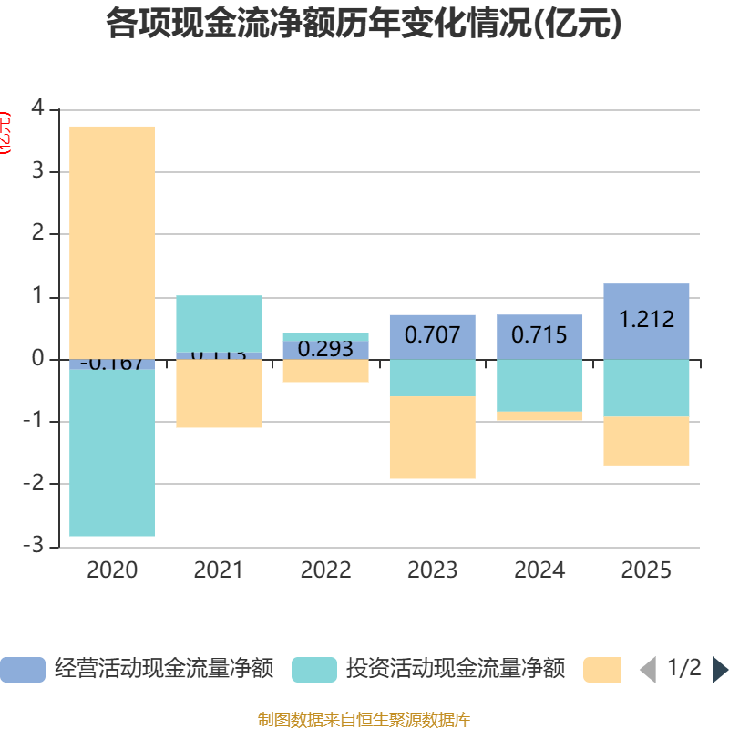 截至2025年,公司经营活动现金流净额为1.21亿元,同比增长69.66%;筹资活动现金流净额-7792.57万元,同比减少6386.13万元;投资活动现金流净额-9208.83万元,上年同期为-8391.43万元。