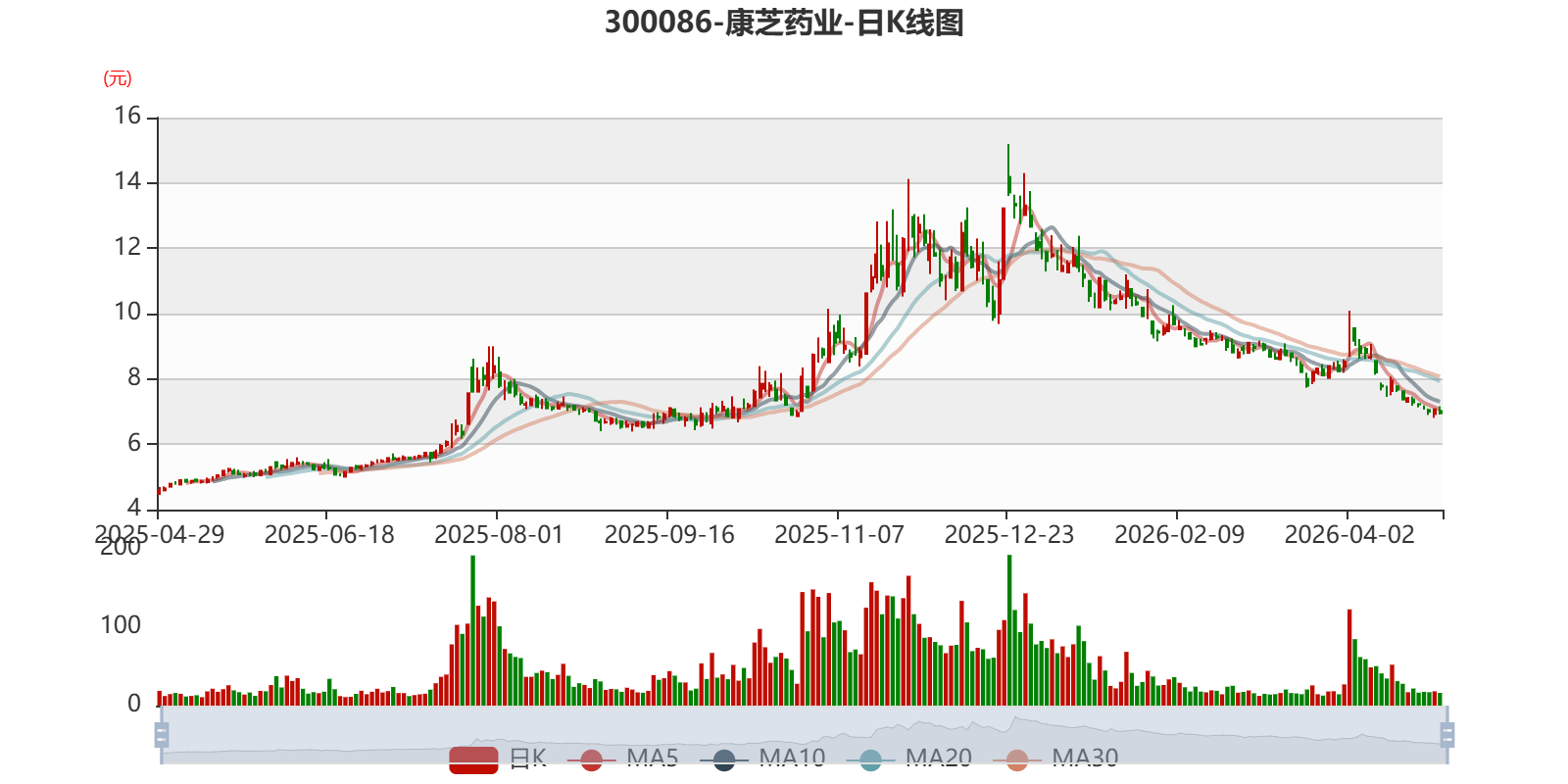 值得注意的是,中登公司数据显示,截至2026年4月24日,康芝药业21.07%股份处于质押状态。年报显示,第一大股东海南宏氏投资有限公司质押9590万股公司股份,占其全部持股的94.69%。