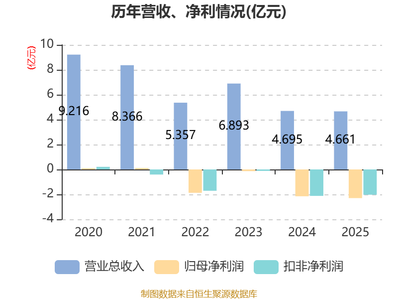 中证智能财讯康芝药业(300086)4月29日披露2025年年度报告。2025年,公司实现营业总收入4.66亿元,同比下降0.72%;归母净利润亏损2.3亿元,上年同期亏损2.15亿元;扣非净利润亏损2.03亿元,上年同期亏损2.12亿元;经营活动产生的现金流量净额为1.21亿元,同比增长69.66%;报告期内,康芝药业基本每股收益为-0.5057元,加权平均净资产收益率为-22.95%。
