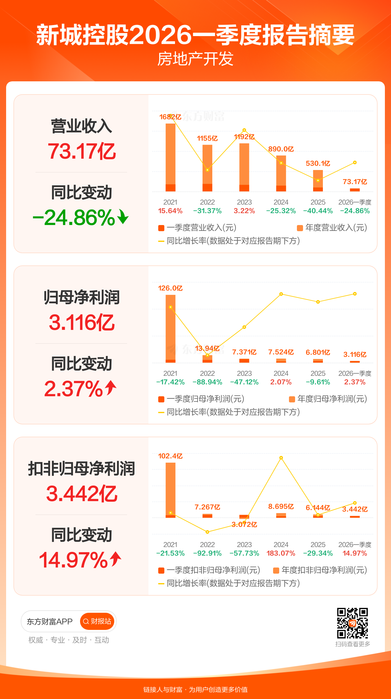 新城控股4月30日发布2026年一季报显示,公司一季度实现营业收入73.17亿元,同比下滑24.86%;归母净利润3.12亿元,同比增长2.37%;扣非归母净利润3.44亿元,同比增长14.97%。