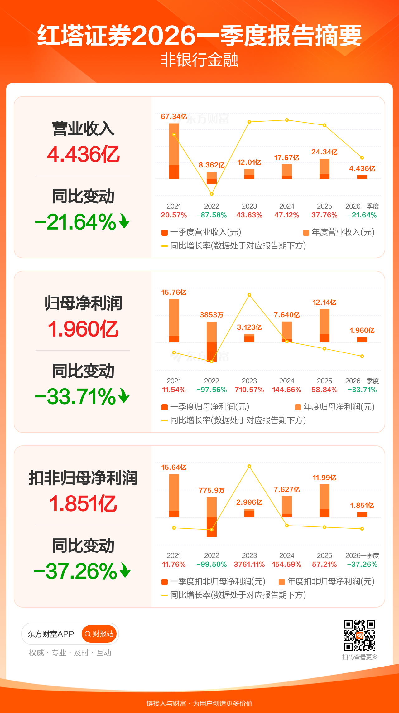 红塔证券4月30日发布2026年一季报显示,公司一季度实现营业收入4.44亿元,同比下滑21.64%;归母净利润1.96亿元,同比下滑33.71%;扣非归母净利润1.85亿元,同比下滑37.26%。