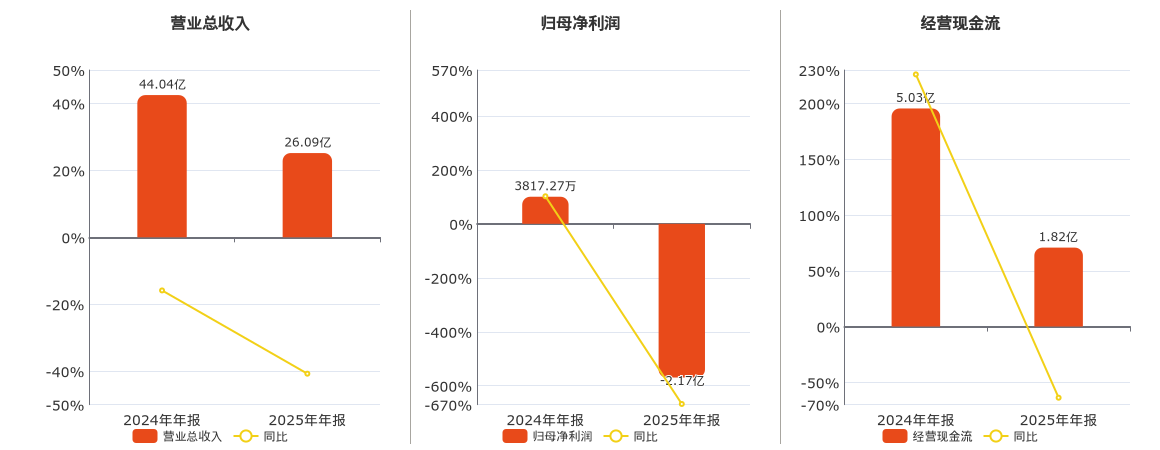 公司营业总收入为26.09亿元,较去年同报告期营业总收入减少17.95亿元,同比较去年同期下降40.75%。归母净利润为-2.17亿元,在已披露的同业公司中排名第33,较去年同报告期归母净利润减少2.55亿元,同比较去年同期下降667.55%。经营活动现金净流入为1.82亿元,较去年同报告期经营活动现金净流入减少3.21亿元,同比较去年同期下降63.80%。