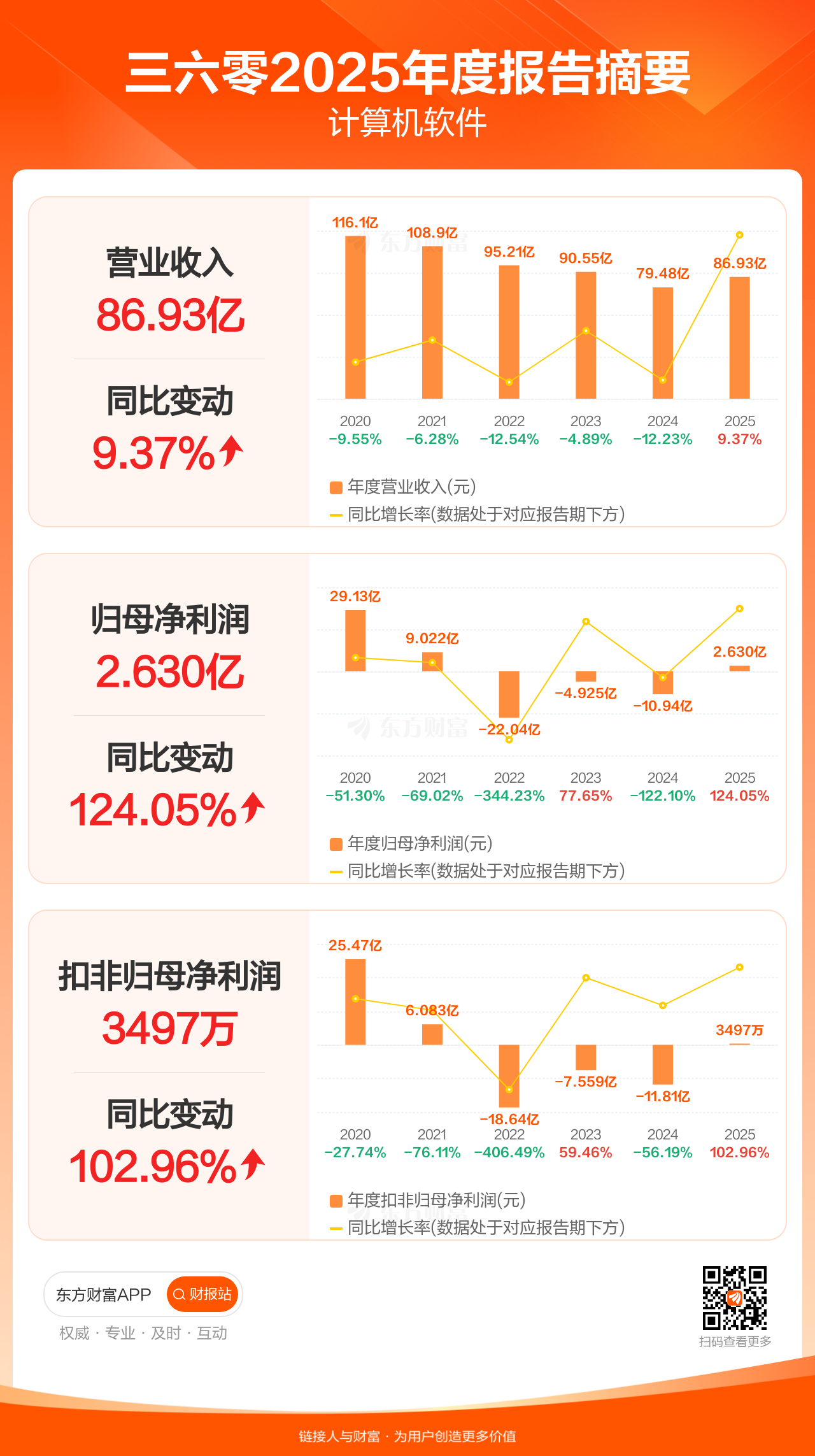 三六零4月30日发布2025年年报显示,公司全年实现营业收入86.93亿元,同比增长9.37%;归母净利润2.63亿元,同比增长124.05%;扣非归母净利润3496.60万元,同比增长102.96%。