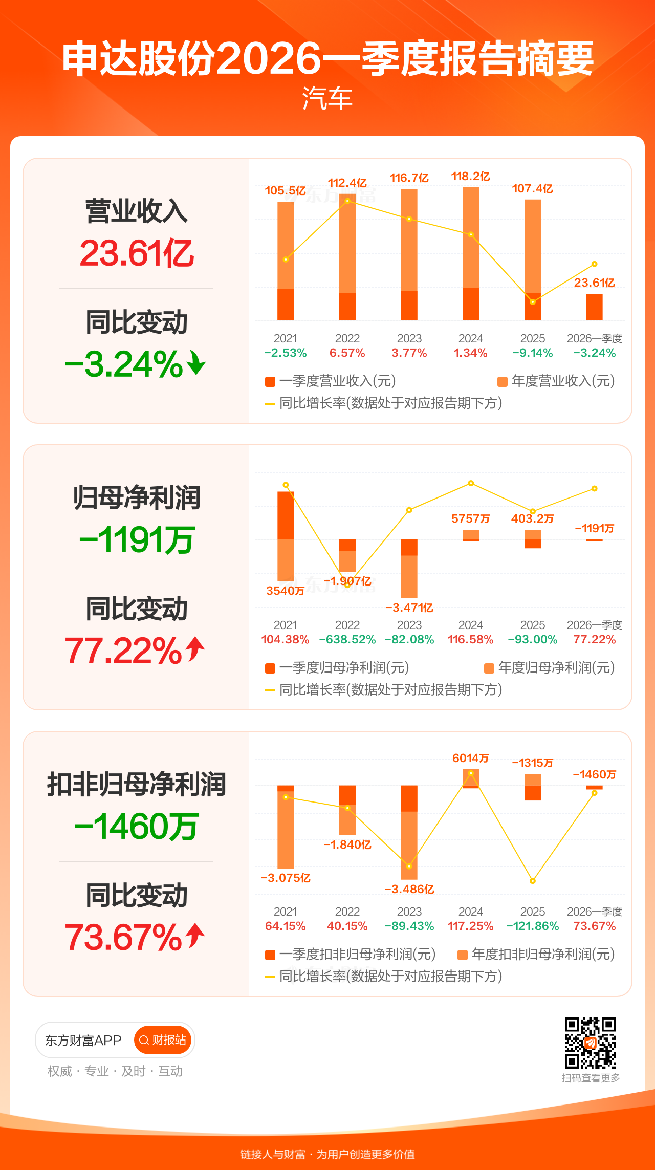 申达股份4月30日发布2026年一季报显示,公司一季度实现营业收入23.61亿元,同比下滑3.24%;归母净利润-1191.41万元;扣非归母净利润-1460.20万元。