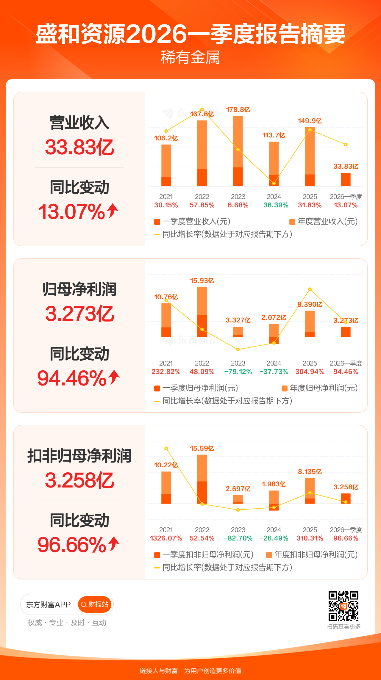 盛和资源4月30日发布2026年一季报显示,公司一季度实现营业收入33.83亿元,同比增长13.07%;归母净利润3.27亿元,同比增长94.46%;扣非归母净利润3.26亿元,同比增长96.66%。