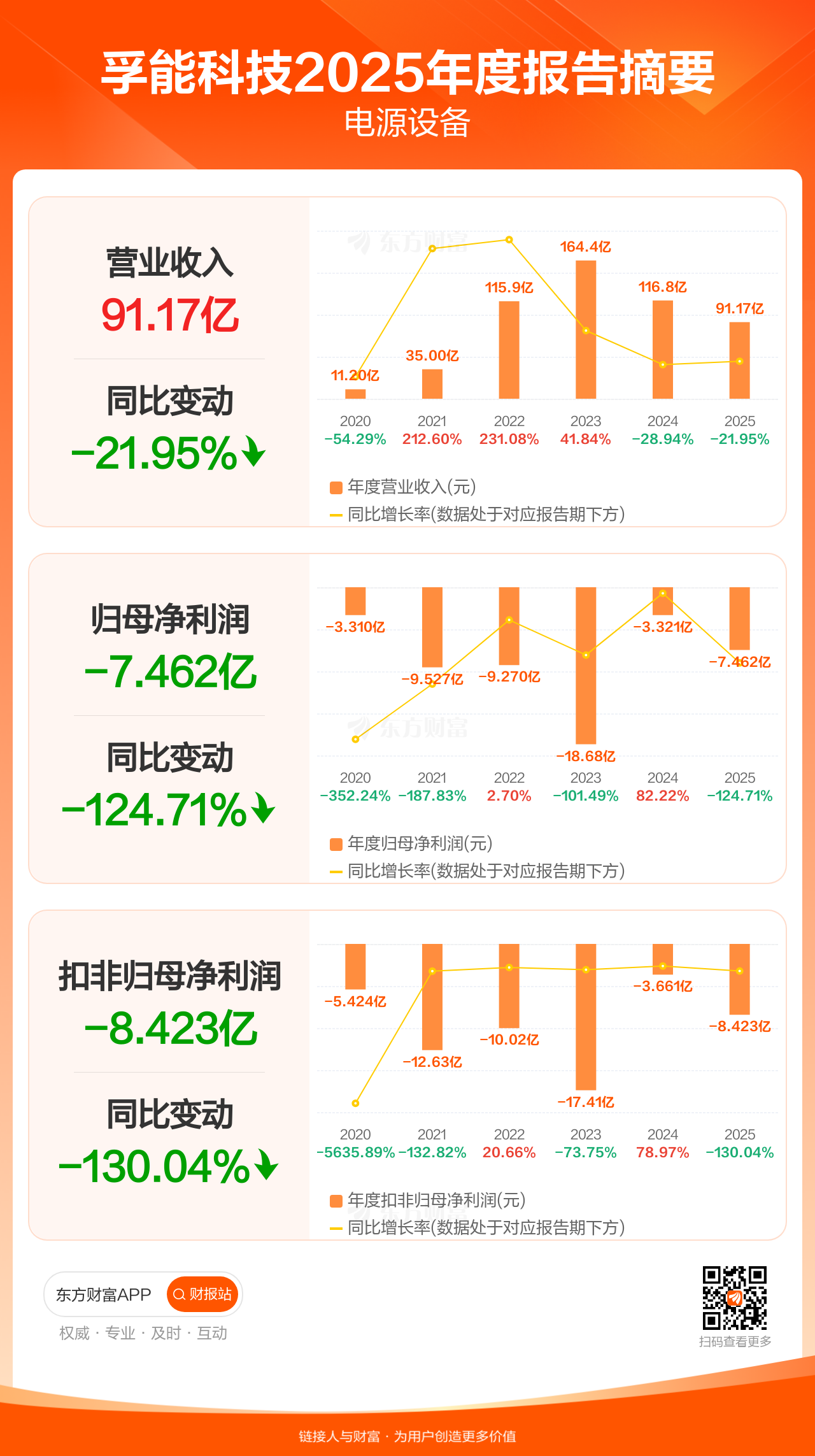 孚能科技4月30日发布2025年年报显示,公司全年实现营业收入91.17亿元,同比下滑21.95%;归母净利润-7.46亿元;扣非归母净利润-8.42亿元。