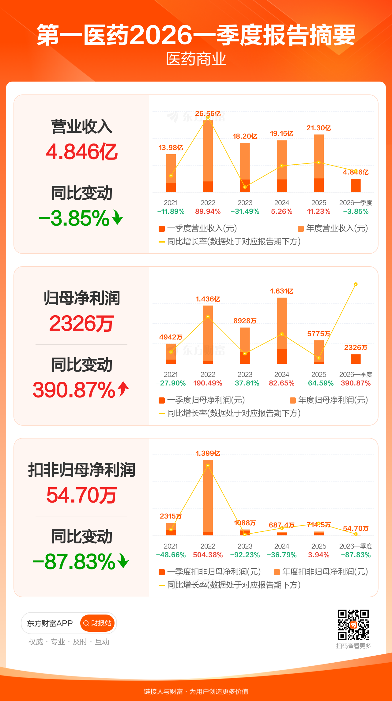 第一医药4月30日发布2026年一季报显示,公司一季度实现营业收入4.85亿元,同比下滑3.85%;归母净利润2326.26万元,同比增长390.87%;扣非归母净利润54.70万元,同比下滑87.83%。
