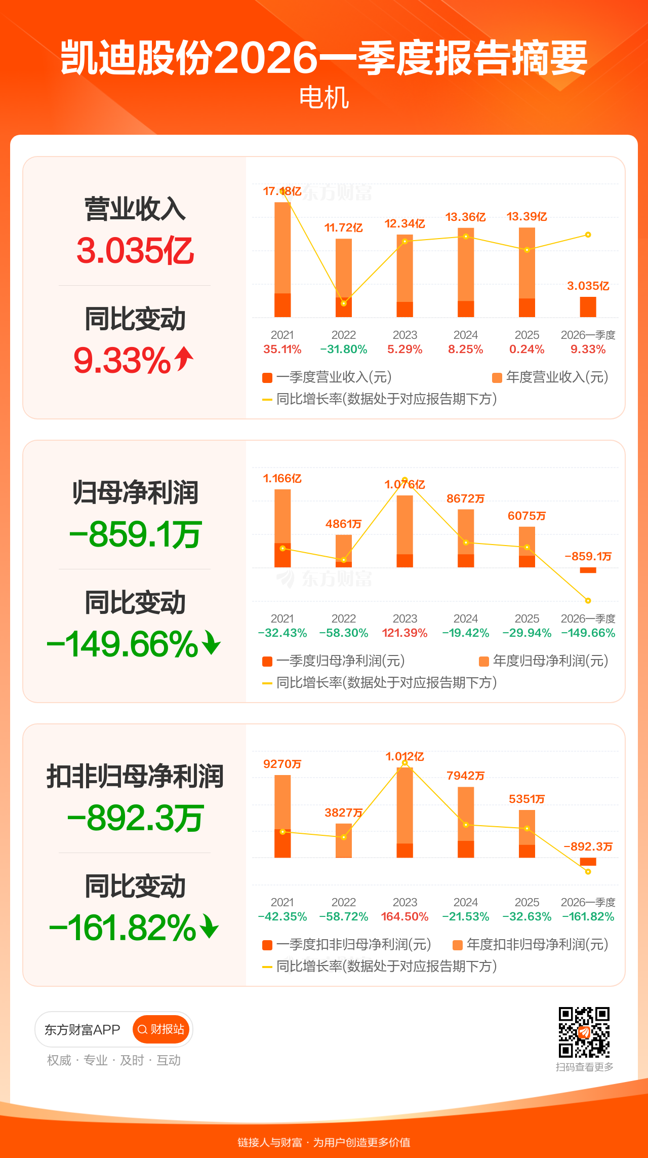 凯迪股份4月30日发布2026年一季报显示,公司一季度实现营业收入3.04亿元,同比增长9.33%;归母净利润-859.10万元;扣非归母净利润-892.35万元。