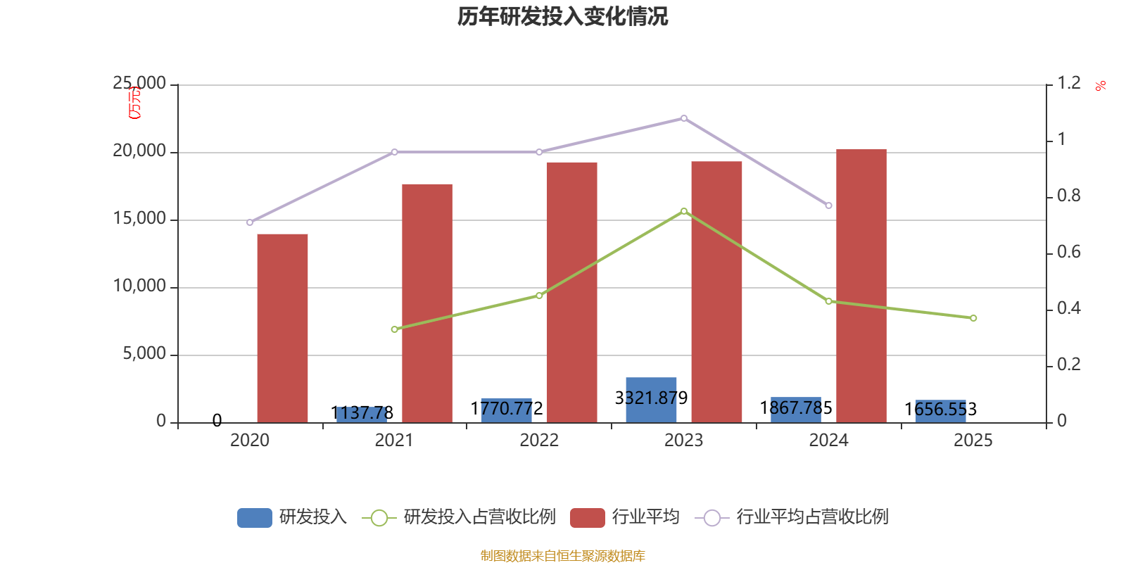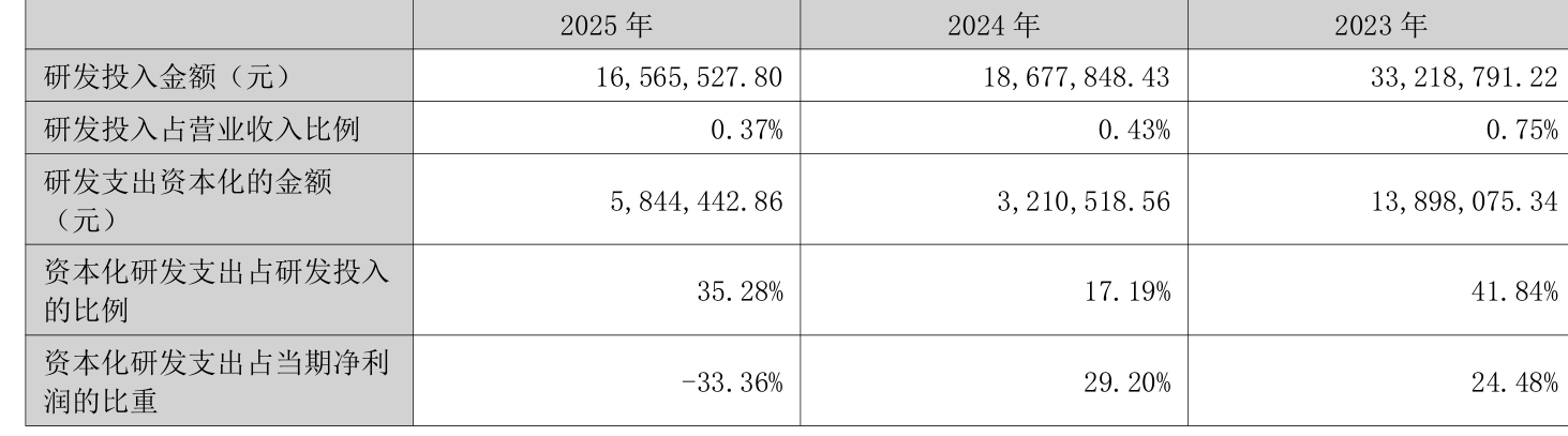 2025年全年,公司研发投入金额为1656.55万元,同比下降11.31%;研发投入占营业收入比例为0.37%,相比上年同期下降0.06个百分点。此外,公司全年研发投入资本化率为35.28%。