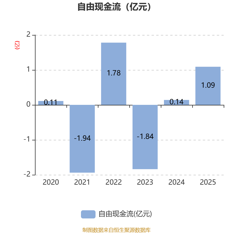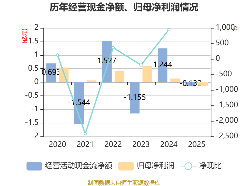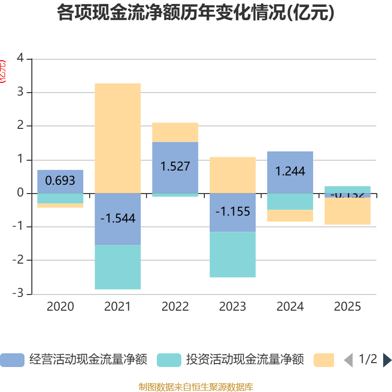 截至2025年,公司经营活动现金流净额为-1322.53万元,同比减少1.38亿元;筹资活动现金流净额-8026.25万元,同比减少4538.6万元;投资活动现金流净额2094.35万元,上年同期为-4973.7万元。