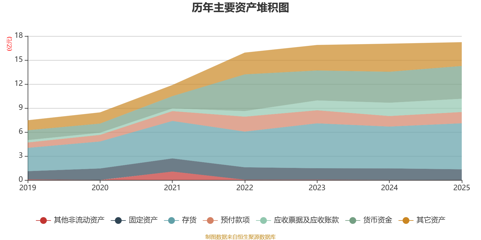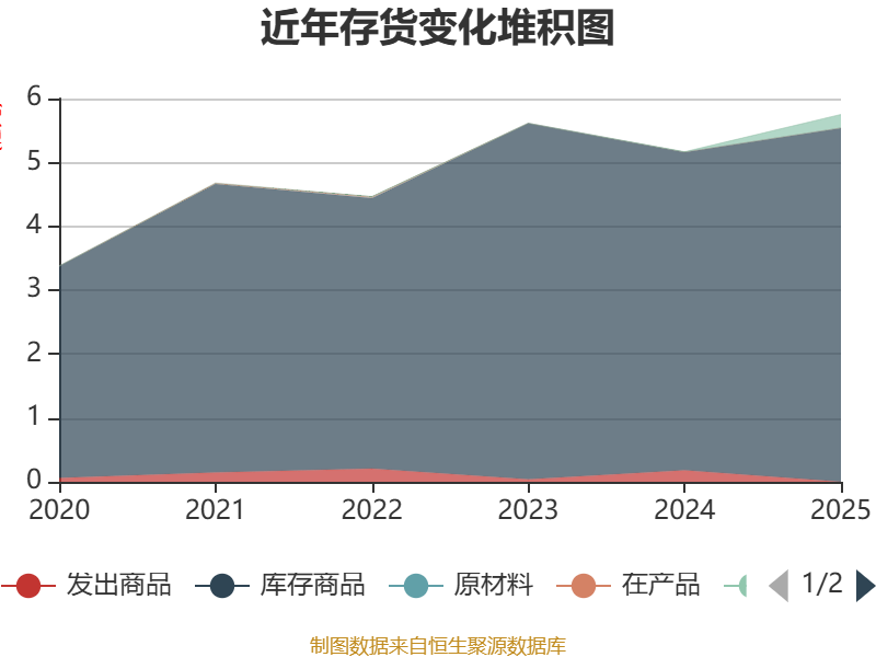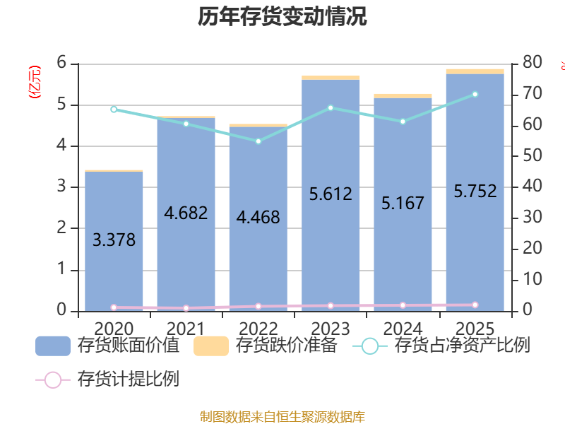 从存货变动来看,截至2025年末,公司存货账面价值为5.75亿元,占净资产的70.08%,较上年末增加5853.32万元。其中,存货跌价准备为1149.17万元,计提比例为1.96%。