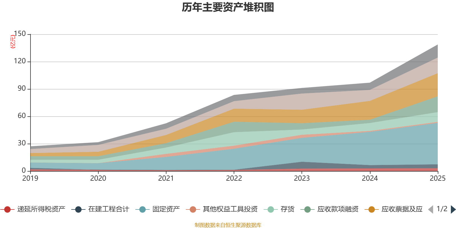 资产重大变化方面,截至2025年末,公司应收款项融资较上年末增加382.62%,占公司总资产比重上升8.78个百分点;固定资产较上年末增加24.63%,占公司总资产比重下降4.91个百分点;应收票据及应收账款较上年末增加22.59%,占公司总资产比重下降3.09个百分点;交易性金融资产合计较上年末增加16640.02%,占公司总资产比重上升1.44个百分点。