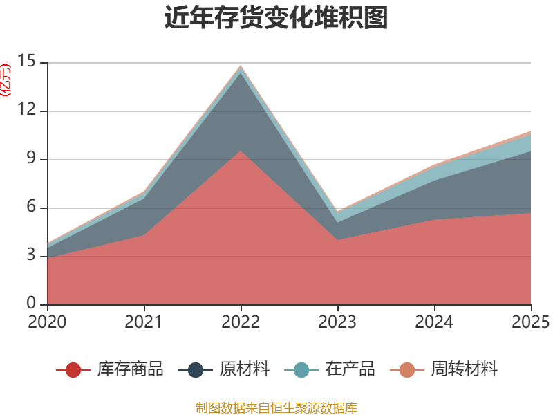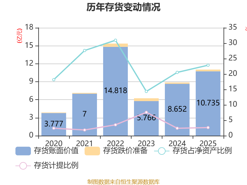 从存货变动来看,截至2025年末,公司存货账面价值为10.74亿元,占净资产的22.85%,较上年末增加2.08亿元。其中,存货跌价准备为2903.91万元,计提比例为2.63%。