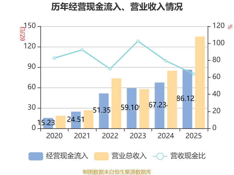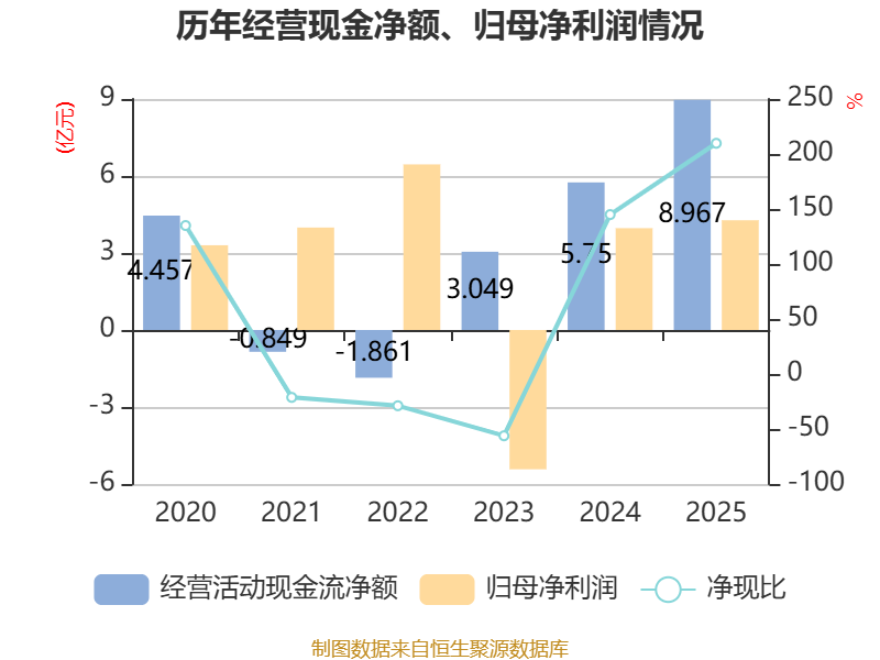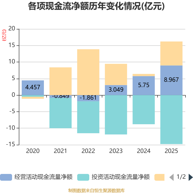 截至2025年,公司经营活动现金流净额为8.97亿元,同比增长55.94%;筹资活动现金流净额7.24亿元,同比增加6.58亿元;投资活动现金流净额-14.8亿元,上年同期为-8.8亿元。