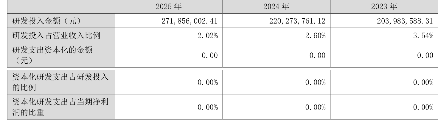2025年全年,公司研发投入金额为2.72亿元,同比增长23.42%;研发投入占营业收入比例为2.02%,相比上年同期下降0.58个百分点。此外,公司全年研发投入资本化率为0%。