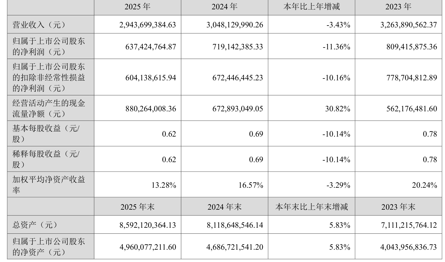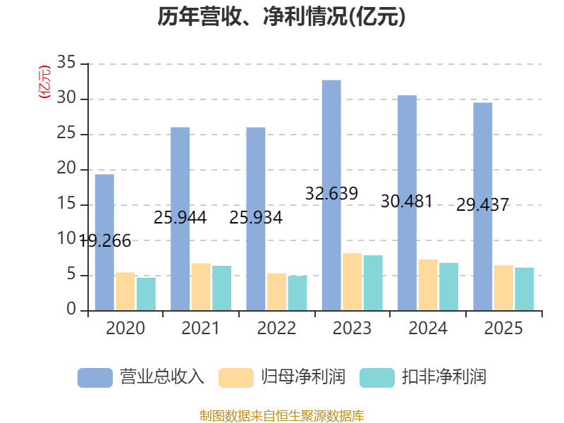 中证智能财讯百润股份(002568)4月29日披露2025年年度报告。2025年,公司实现营业总收入29.44亿元,同比下降3.43%;归母净利润6.37亿元,同比下降11.36%;扣非净利润6.04亿元,同比下降10.16%;经营活动产生的现金流量净额为8.8亿元,同比增长30.82%;报告期内,百润股份基本每股收益为0.62元,加权平均净资产收益率为13.28%。公司2025年度分配预案为:拟向全体股东每10股派现3元(含税)。