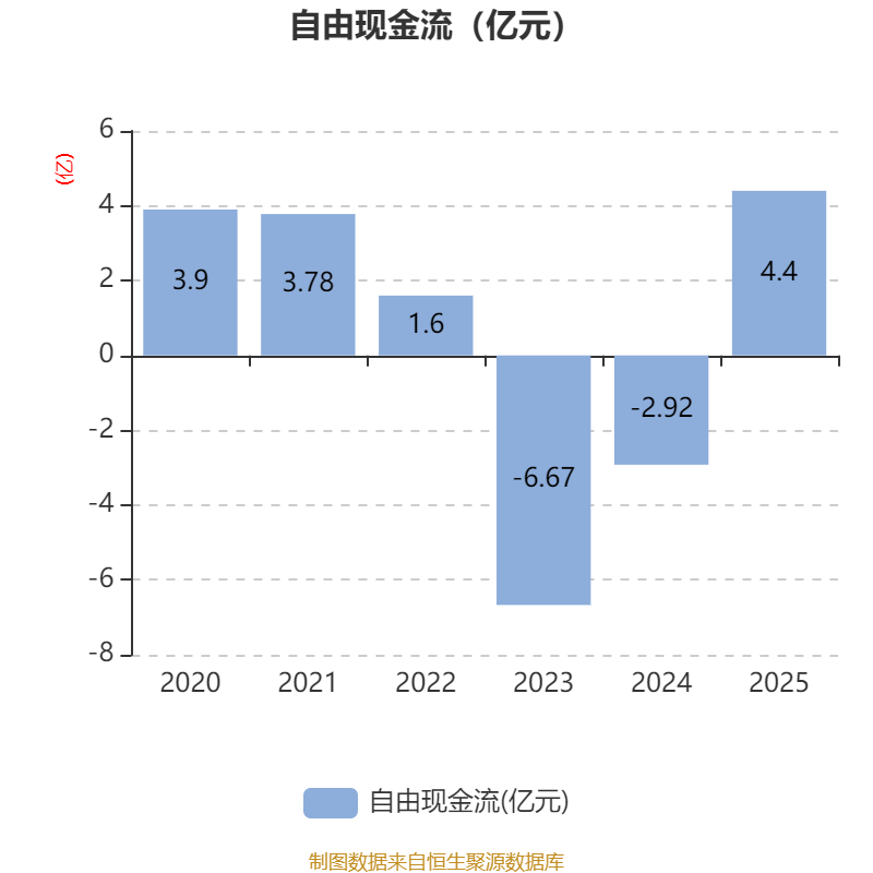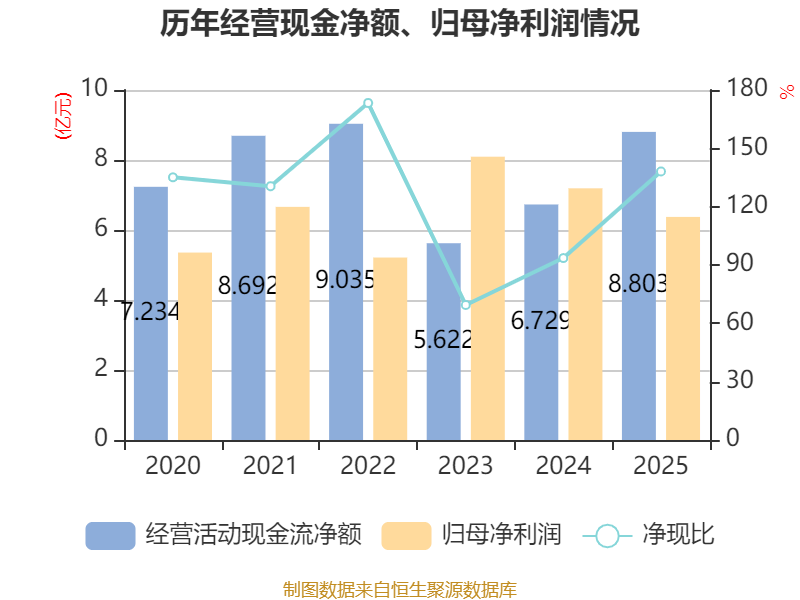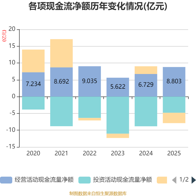 截至2025年,公司经营活动现金流净额为8.8亿元,同比增长30.82%;筹资活动现金流净额-3.08亿元,同比减少5.38亿元;投资活动现金流净额-4.81亿元,上年同期为-8.83亿元。