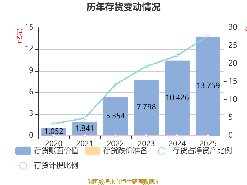 从存货变动来看,截至2025年末,公司存货账面价值为13.76亿元,占净资产的27.74%,较上年末增加3.33亿元。公司本期没有计提存货跌价准备。