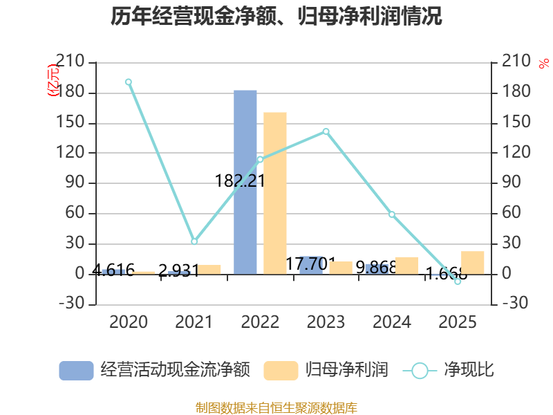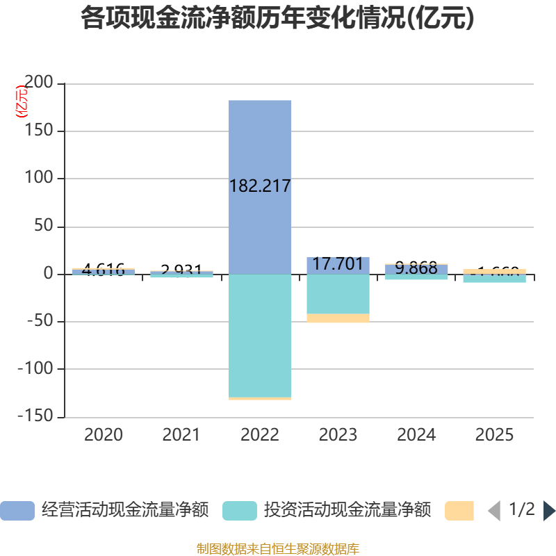 截至2025年,公司经营活动现金流净额为-1.67亿元,同比减少11.54亿元;筹资活动现金流净额5.24亿元,同比增加4.27亿元;投资活动现金流净额-7.28亿元,上年同期为-5.81亿元。