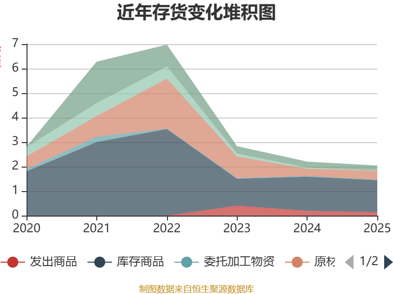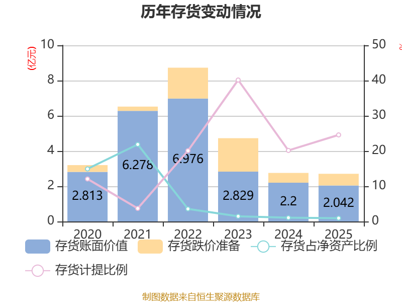 从存货变动来看,截至2025年末,公司存货账面价值为2.04亿元,占净资产的0.94%,较上年末减少1576.64万元。其中,存货跌价准备为6652.44万元,计提比例为24.57%。