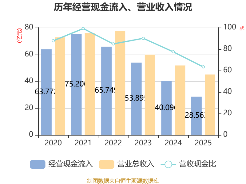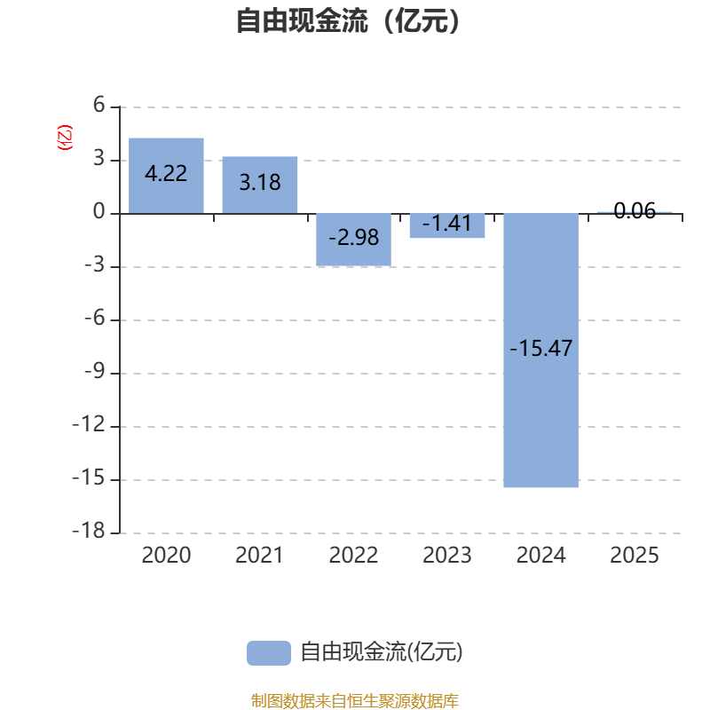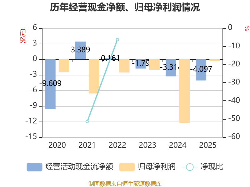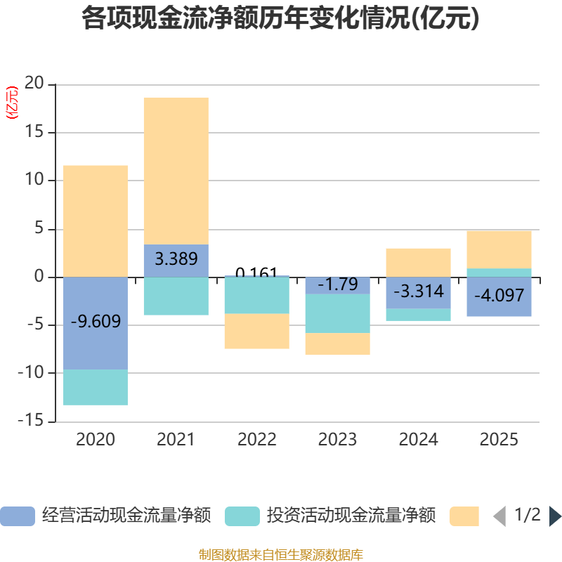 截至2025年,公司经营活动现金流净额为-4.1亿元,同比减少7831.62万元;筹资活动现金流净额3.89亿元,同比增加9383.43万元;投资活动现金流净额8885.15万元,上年同期为-1.25亿元。