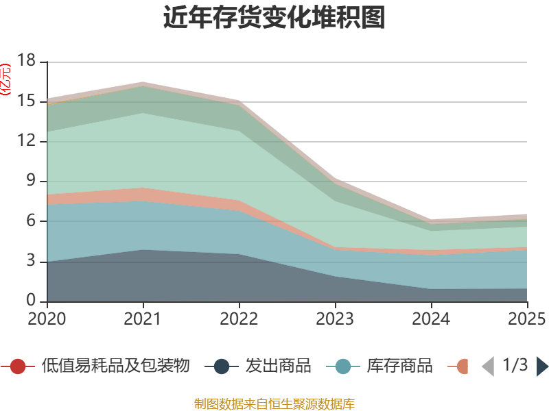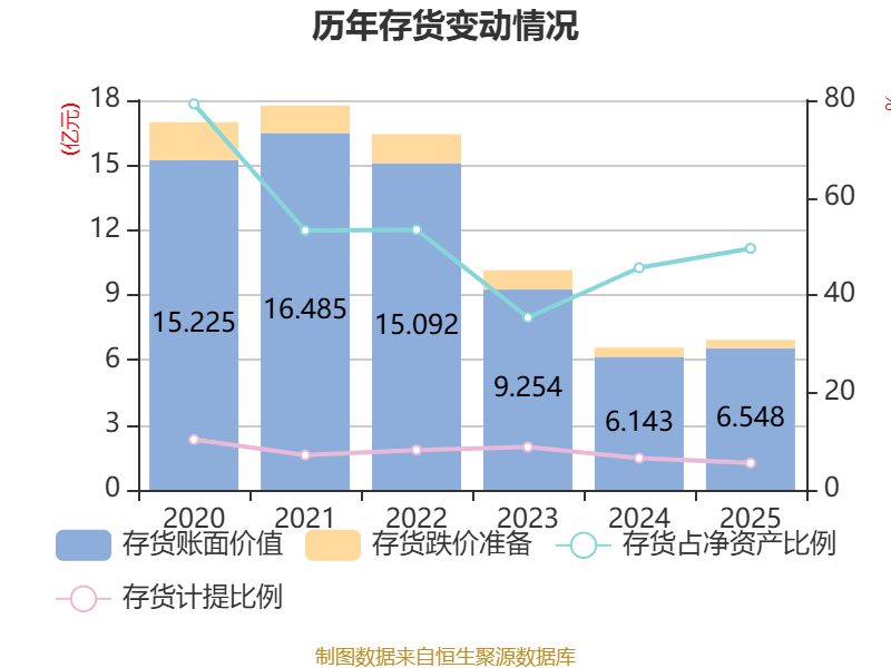 从存货变动来看,截至2025年末,公司存货账面价值为6.55亿元,占净资产的49.56%,较上年末增加4052.52万元。其中,存货跌价准备为3823.27万元,计提比例为5.52%。