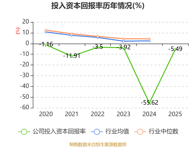 数据显示,2025年公司加权平均净资产收益率为-2.54%,较上年同期上升58.61个百分点。公司2025年投入资本回报率为-5.49%,较上年同期上升50.13个百分点。