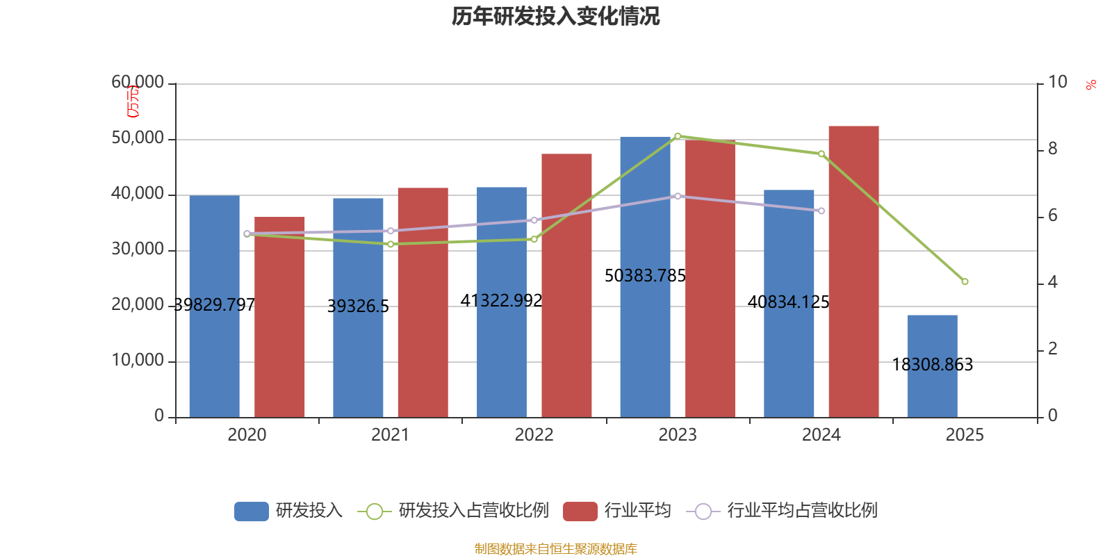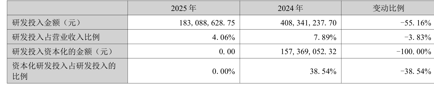 2025年全年,公司研发投入金额为1.83亿元,同比下降55.16%;研发投入占营业收入比例为4.06%,相比上年同期下降3.83个百分点。此外,公司全年研发投入资本化率为0%。