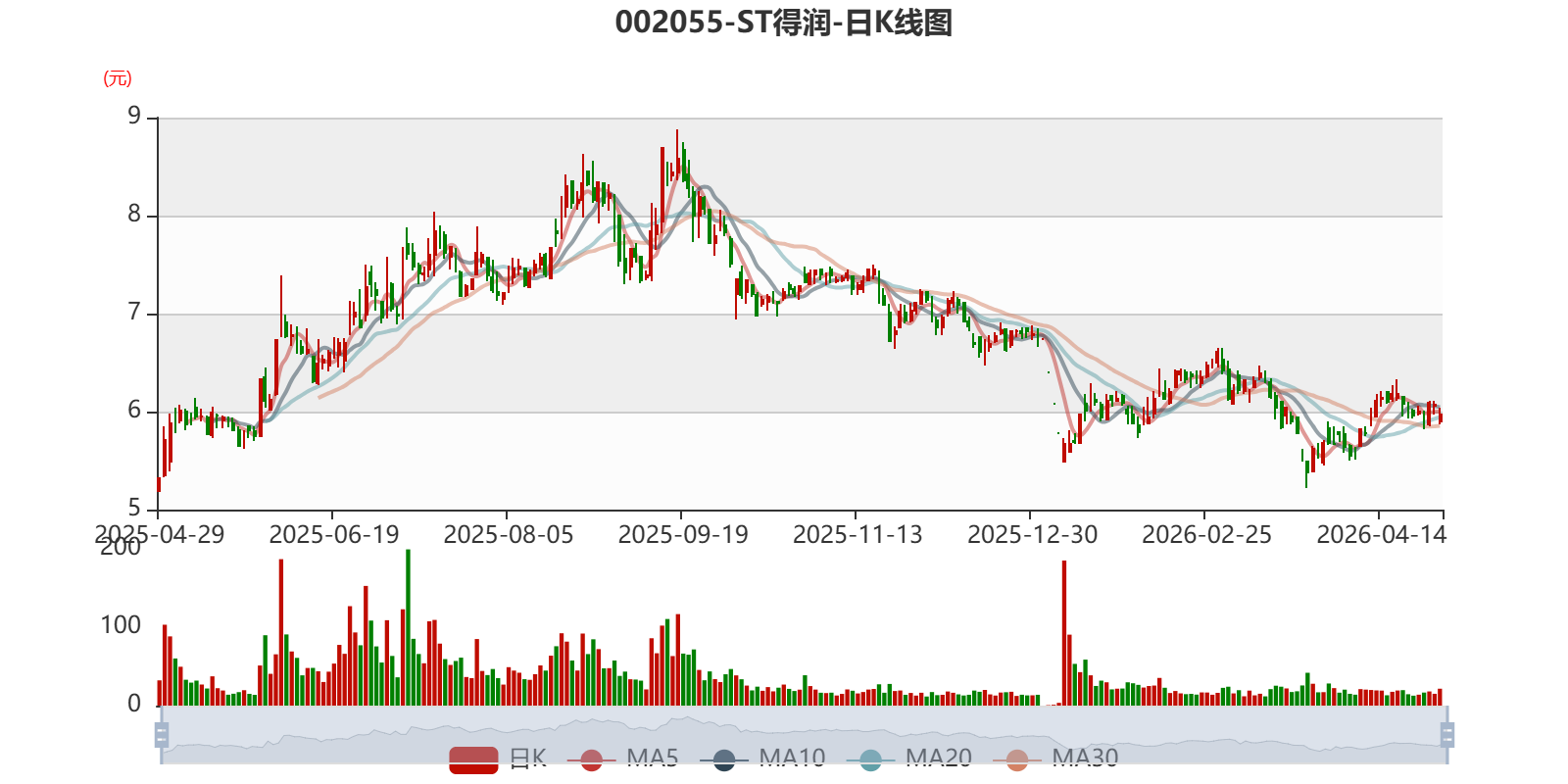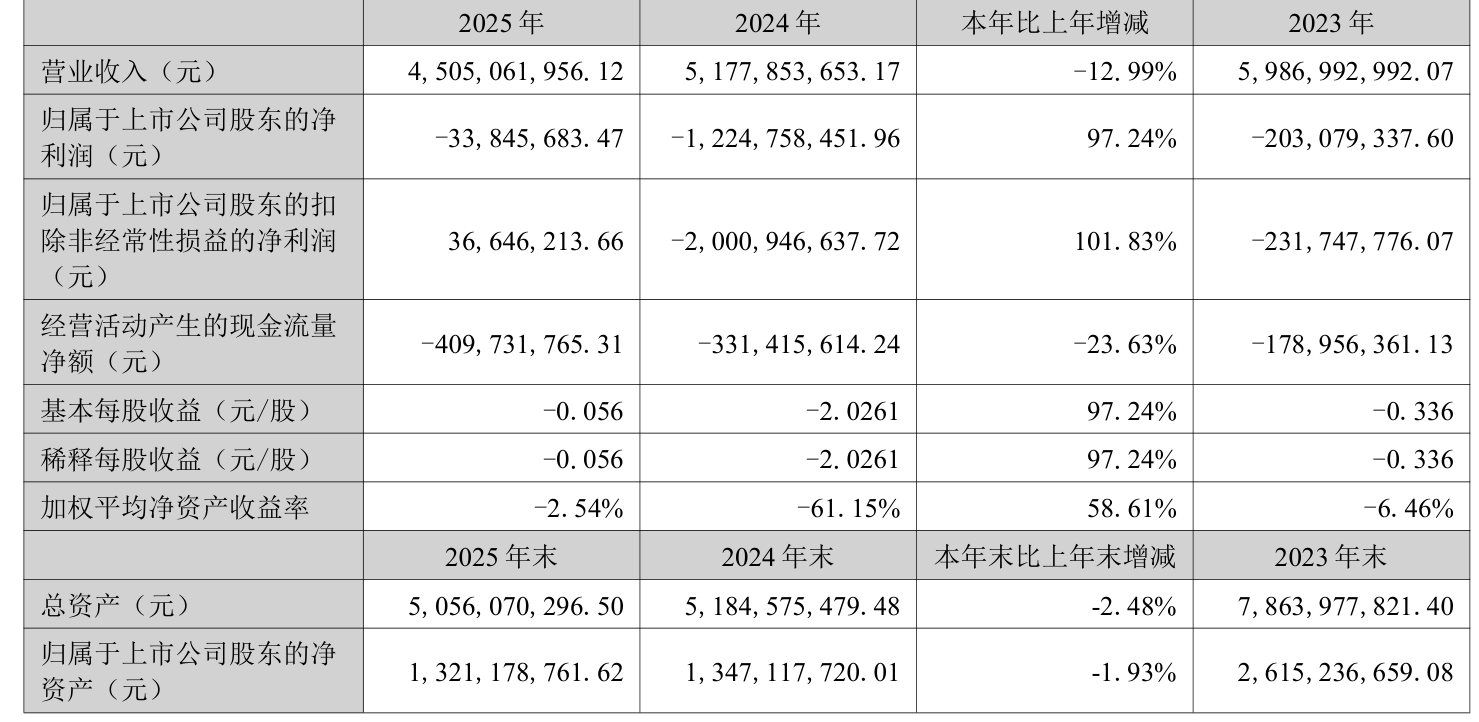 中证智能财讯 ST得润(002055)4月29日披露2025年年度报告。2025年,公司实现营业总收入45.05亿元,同比下降12.99%;归母净利润亏损3384.57万元,上年同期亏损12.25亿元;扣非净利润3664.62万元,同比扭亏;经营活动产生的现金流量净额为-4.1亿元,上年同期为-3.31亿元;报告期内,ST得润基本每股收益为-0.056元,加权平均净资产收益率为-2.54%。