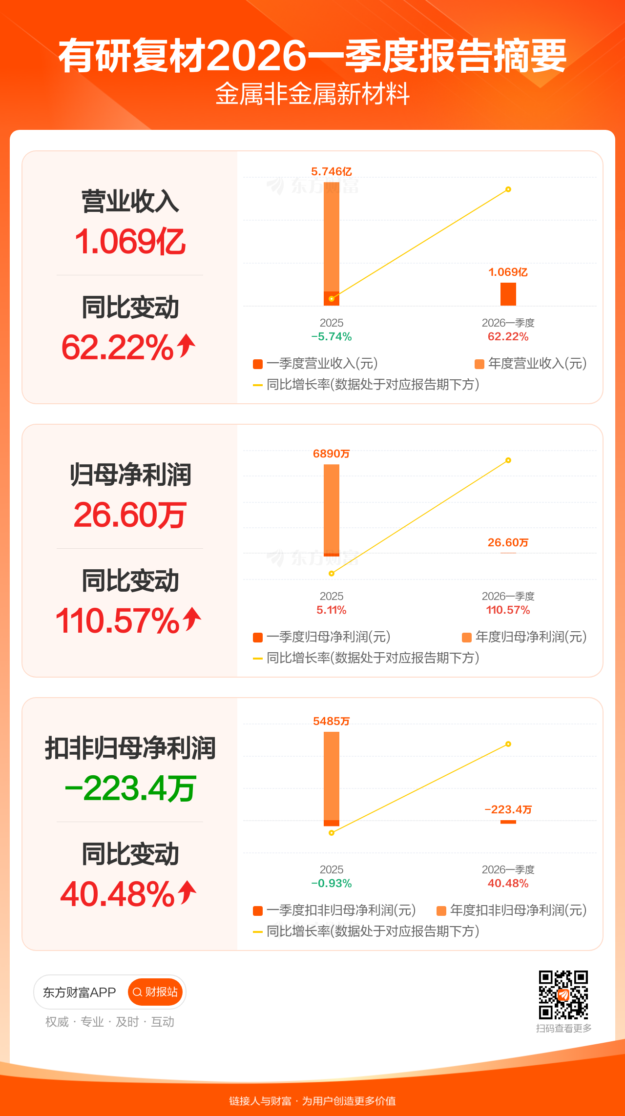 有研复材4月30日发布2026年一季报显示,公司一季度实现营业收入1.07亿元,同比增长62.22%;归母净利润26.60万元,同比增长110.57%;扣非归母净利润-223.36万元。