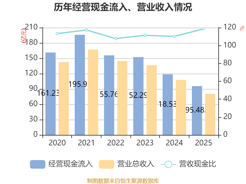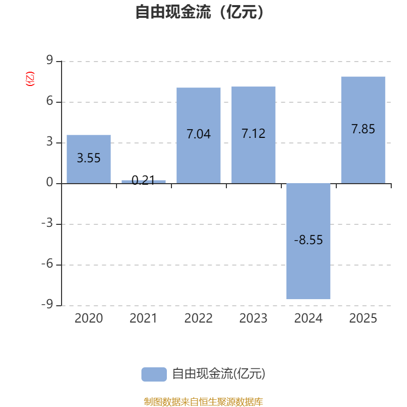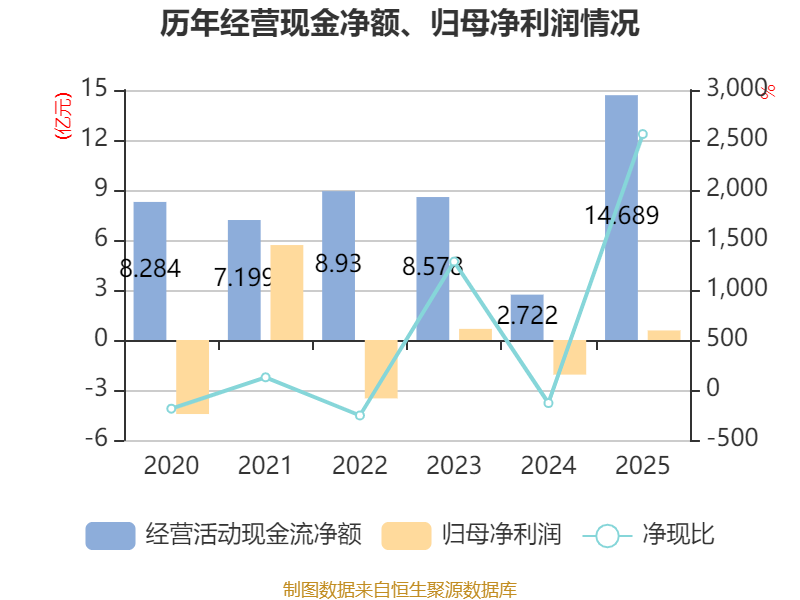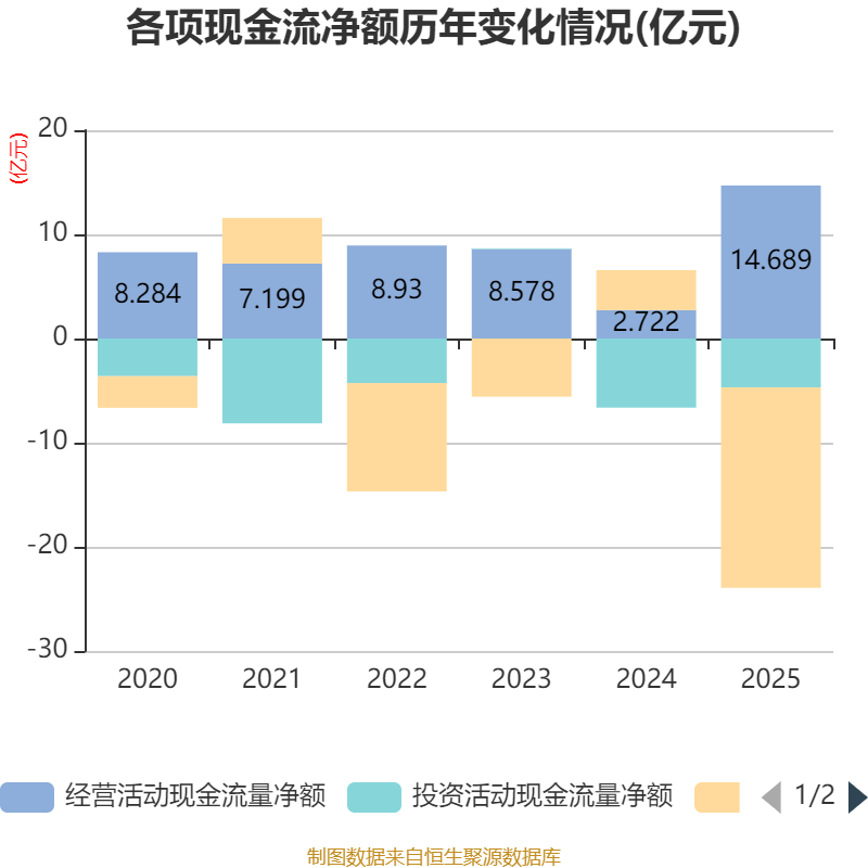 截至2025年,公司经营活动现金流净额为14.69亿元,同比增长439.6%;筹资活动现金流净额-19.24亿元,同比减少23.08亿元;投资活动现金流净额-4.69亿元,上年同期为-6.64亿元。