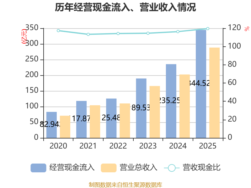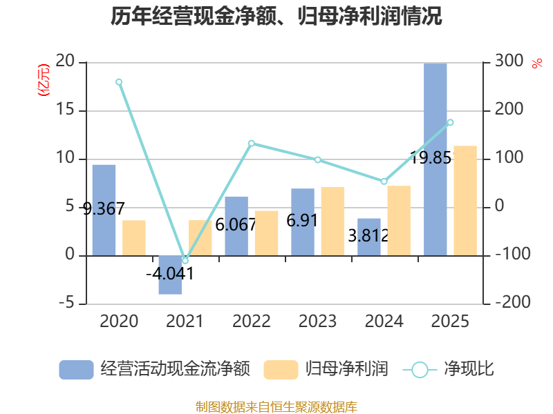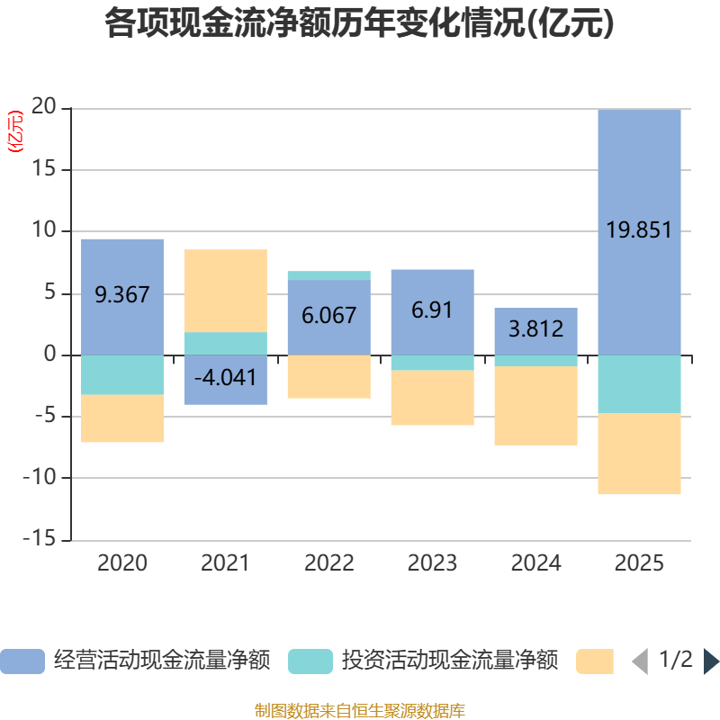 截至2025年,公司经营活动现金流净额为19.85亿元,同比增长420.7%;筹资活动现金流净额-6.56亿元,同比减少1579.76万元;投资活动现金流净额-4.72亿元,上年同期为-9291.44万元。